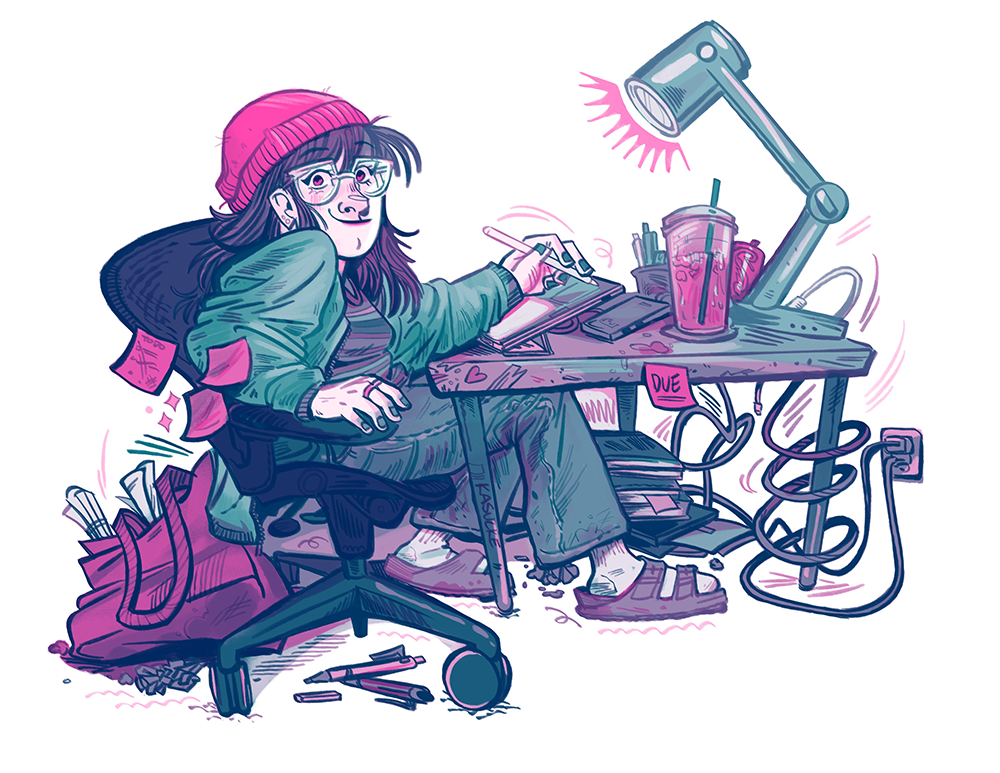 Emily Kasulke is an illustrator, comics artist and printmaker from Annapolis, Maryland. Her body of work is informed by her lived experiences, and relationships with other people and herself. She primarily creates art within the digital realm, but loves to play with the Risograph printer, as well as making linocut prints. When she is not creating, Emily enjoys spending time with friends, shooting film, traveling to see new places and eating delicious food.